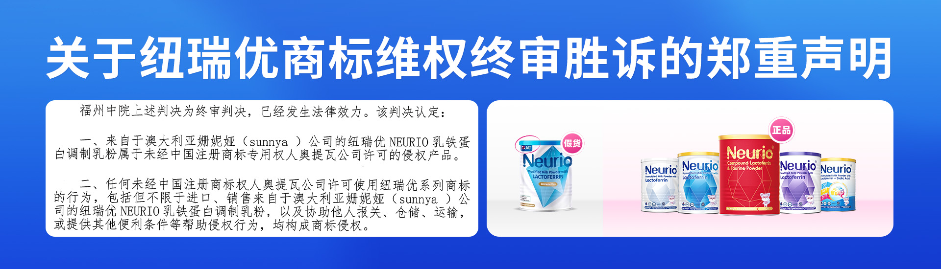 Neurio (中文品牌名:紐瑞優(yōu))意即 “New for You(創(chuàng)新為你)” ,自2011年品牌創(chuàng)建以來, 秉承“創(chuàng)新為你·健康至上” 的理念,讓健康伴隨生活。 紐瑞優(yōu)Neurio產(chǎn)品從國際引入中國,快速落地生根,并在中國實現(xiàn)品牌騰飛!紐瑞優(yōu)持續(xù)努力將自己打造為一個國際知名品牌,前期主要以澳新產(chǎn)品為主,現(xiàn)已轉型為以國際產(chǎn)品為主,并堅定不移深耕中國本土化產(chǎn)品,擴大國際營銷, 實現(xiàn)從國際引進中國,再從中國走向國際,讓紐瑞優(yōu)品牌再上一個新的臺階! 自2015年,紐瑞優(yōu)團隊經(jīng)過不懈努力成功研發(fā)紐瑞優(yōu)乳鐵蛋白系列調制乳粉,奉獻給熱愛健康的人們。 紐瑞優(yōu)團隊專注大健康理念,包括孕產(chǎn)婦與胎兒健康,兒童青少年的健康成長以及中老年人的健康營養(yǎng)需求,不斷推陳出新,為大健康理念貢獻自己的一份力量。 紐瑞優(yōu)永不止步,不斷探索和追尋更新的健康理念,不斷自我超越追求更高的目標, 不斷努力研發(fā)生產(chǎn)符合市場需求的質優(yōu)價美產(chǎn)品,滿足人們對健康和高品質生活的追求!